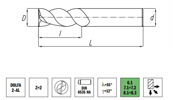 Frezy trzpieniowe DOLFA 2-AL do obróbki metali lekkich, 2-ostrzowe, z czołem płaskim, chwyt walcowy gładki. Linia śrubowa rowków wiórowych λ=55°, promieniowy kąt natarcia γ=12°, wysokiej jakości powierzchnie skrawające oraz inne cechy konstrukcyjne pozwalają na wydajną obróbkę aluminium i innych metali nieżelaznych oraz tworzyw sztucznych. Możliwość pracy bokiem oraz zagłębiania się wzdłuż osi narzędzia dzięki ostrzom centralnym na czole.