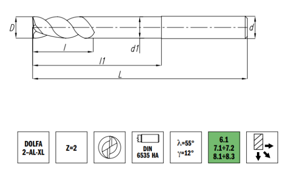 Frezy trzpieniowe DOLFA 2-AL do obróbki metali lekkich, 2-ostrzowe, z czołem płaskim, chwyt walcowy gładki. Linia śrubowa rowków wiórowych λ=55°, promieniowy kąt natarcia γ=12°, wysokiej jakości powierzchnie skrawające oraz inne cechy konstrukcyjne pozwalają na wydajną obróbkę aluminium i innych metali nieżelaznych oraz tworzyw sztucznych. Możliwość pracy bokiem oraz zagłębiania się wzdłuż osi narzędzia dzięki ostrzom centralnym na czole.