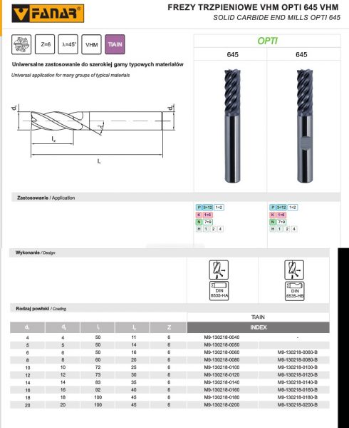 FREZ TRZPIENIOWY PEŁNOWĘGLIKOWY OPTI 645 FI 12X12X30X73 VHM TiALN 6 OSTRZOWY (FANAR)