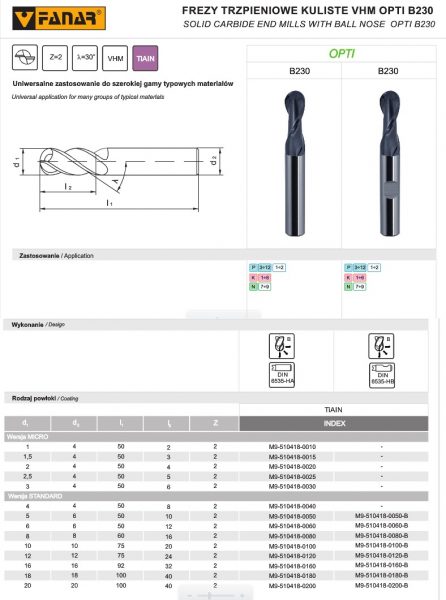 FREZ TRZPIENIOWY PEŁNOWĘGLIKOWY OPTI B230 FI 1X4X2X50 VHM TiALN 2 OSTRZOWY KULISTY (FANAR)