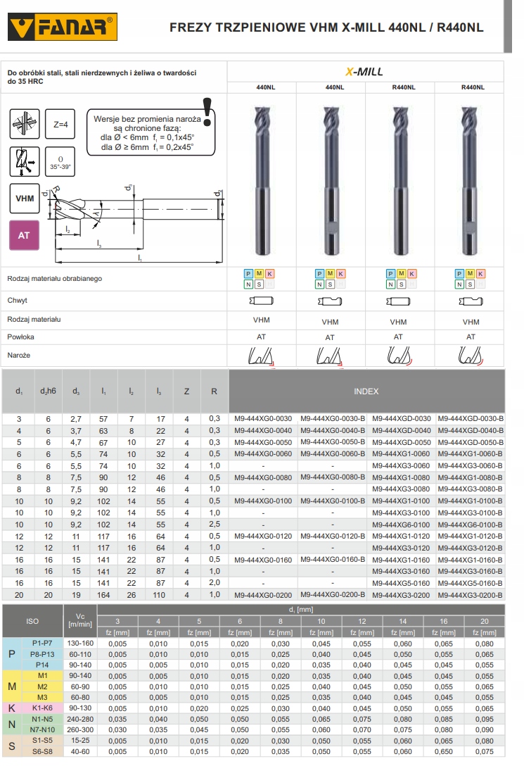 X-MILL R440NL Frezy węglikowe z promieniem naroża długie z szyjką VHM z powłoką AT ogólnego przeznaczenia do obróbki materiałów o twardości do 35 HRC.