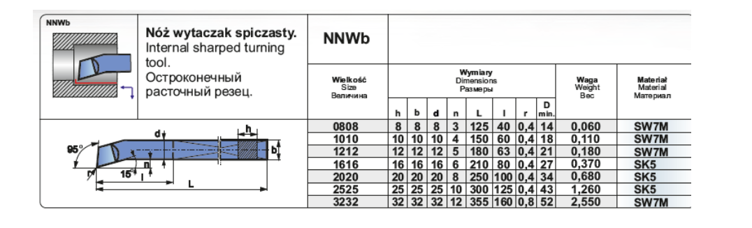 Nóż tokarski NNWb SW7M, SK5 Wytaczak Szpicak od renomowanego producenta Pafana to wyjątkowy przyrząd, którego jakość wykonania z stali szybkotnącej zapewnia długotrwałą i efektywną pracę. Idealny do precyzyjnego wytaczania oraz obróbki materiałów, ten model cechuje się doskonałą wytrzymałością oraz odpornością na wysokie temperatury. Dzięki swojemu ergonomicznemu kształtowi, korzystanie z narzędzia jest wygodne i efektywne. Nóż NNWb SW7M , SK5.