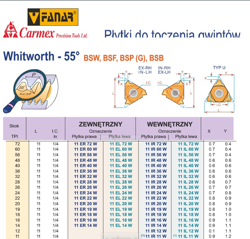 - Zalety: jedną płytką można wykonać duży zakres średnic gwintu o tym samym skoku; płytki zapewniają doskonałą wydajność w czasie skrawania i długi czas użytkowania