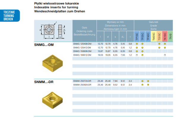 Płytki DOLFAMEX SNMG do toczenia stali i stali nierdzewnych, żeliwa , superstopów geometria średnia .