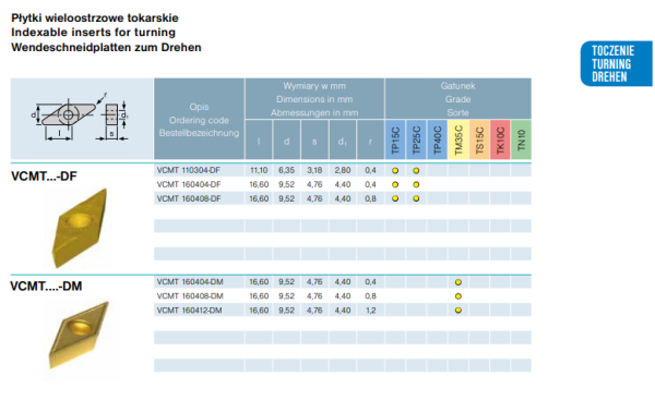 Płytki DOLFAMEX VCMT do toczenia stali nierdzewnej, superstopyów geometria średnia.
