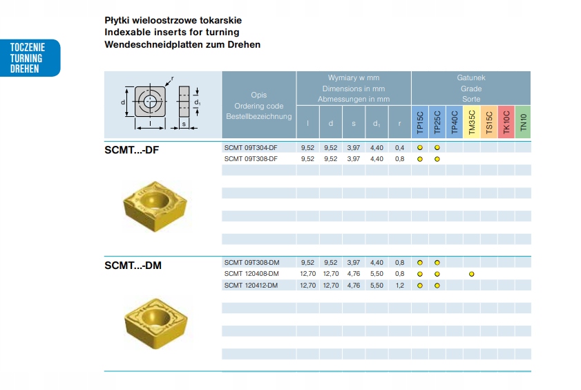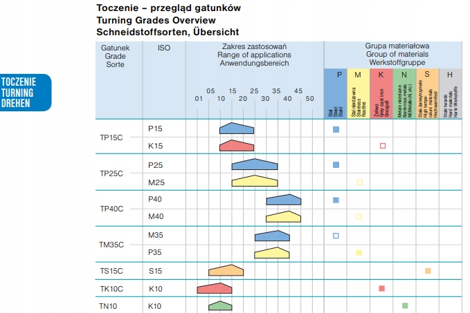 Podstawowy gatunek do obróbki materiałów stalowych i łatwo skrawalnych stali nierdzewnych ze średnimi szybkościami skrawania, włączając skrawanie przerywane. Gatunek ogólnego zastosowania charakteryzuje się wysoką trwałością i doskonałą odpornością przy szerokim zakresie zastosowań.