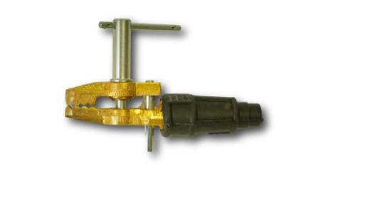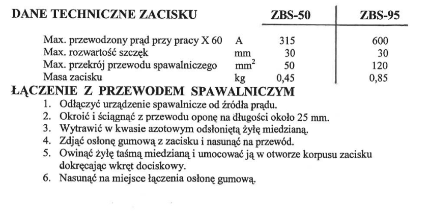 Zacisk biegunowy śrubowo – kleszczowy służy do szybkiego i pewnego mocowania jednego z biegunów źródła prądu do materiału spawanego lub też do stołu spawalniczego. Do zacisku można zamocować przewód spawalniczy o przekroju wg tabeli za pomocą wkrętów dociskowych. Szczęki dociskowe wykonane są z mosiądzu co wpływa na dobrą przewodność prądu spawania jak i właściwą trwałość eksploatacyjną. Zacisk szczęk na materiale odbywa się za pomocą pokrętła i połączenia śrubowego. Miejsce mocowania przewodu spawalniczego z korpusem zacisku osłonięte jest osłoną gumową.